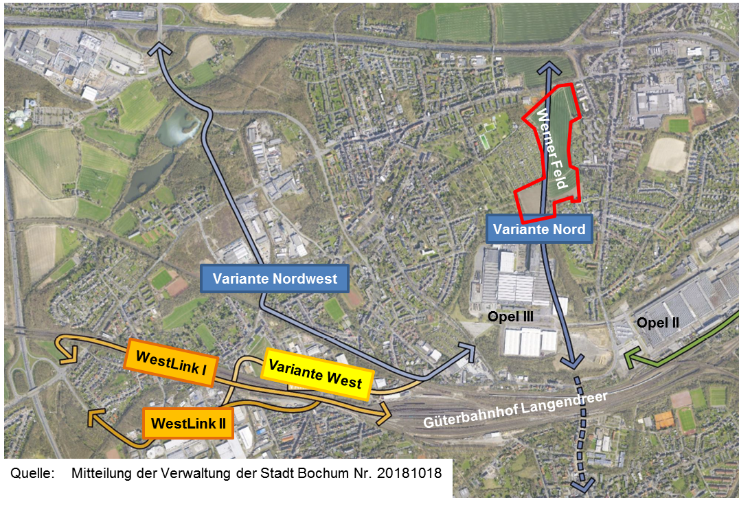 Die Bürgerinitiative WernerFeld hat 2017 mit den zwei WestLink-Varianten Alternativen zur Nord Variante erarbeitet. Beide Varianten werden in 2018 in weitergehenden Gutachten [23] berücksichtigt. Begrüßenswert finden wir es, dass in diesen neuen Untersuchungen mit der Variante Nordwest eine weitere Anbindung an das Autobahnnetz ins Spiel gebracht wird, die keine Freiflächen in Anspruch nehmen würde.